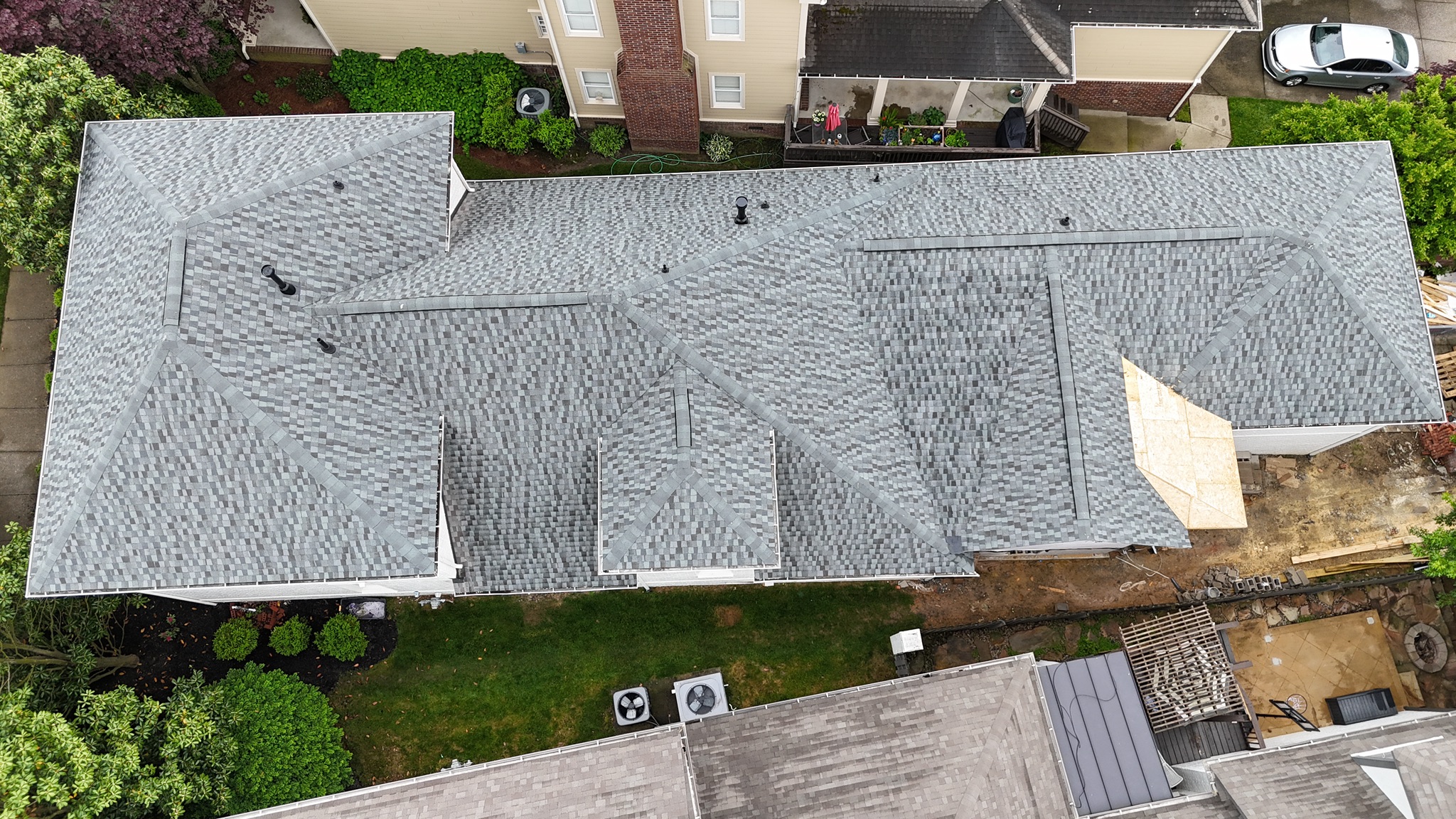 Three Stone installed a new roof featuring GAF Timberline HDZ Weathered Wood shingles.